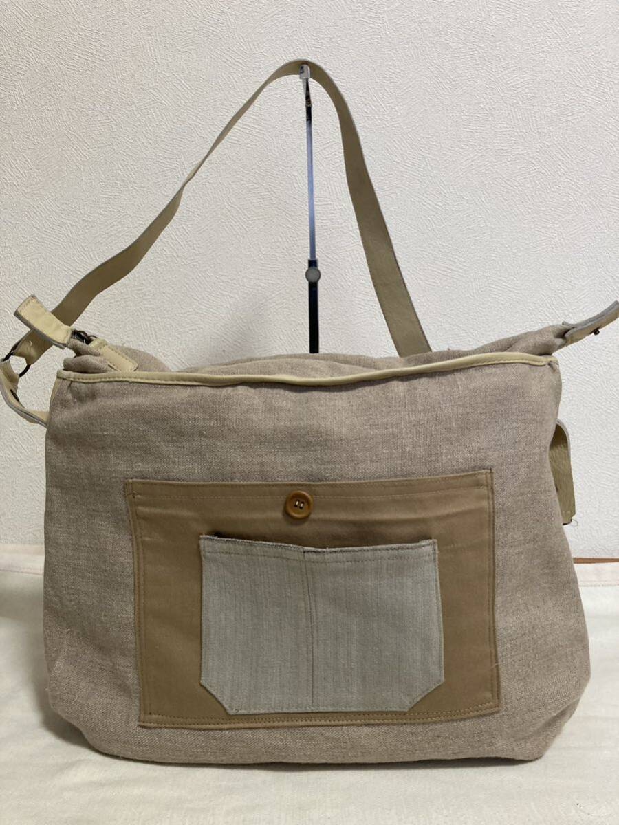 - 【美品】ブランド不明 ハンドメイド 帆布ショルダーバッグ カーキ 味わい深い 使えるサイズ お洒落 激安!