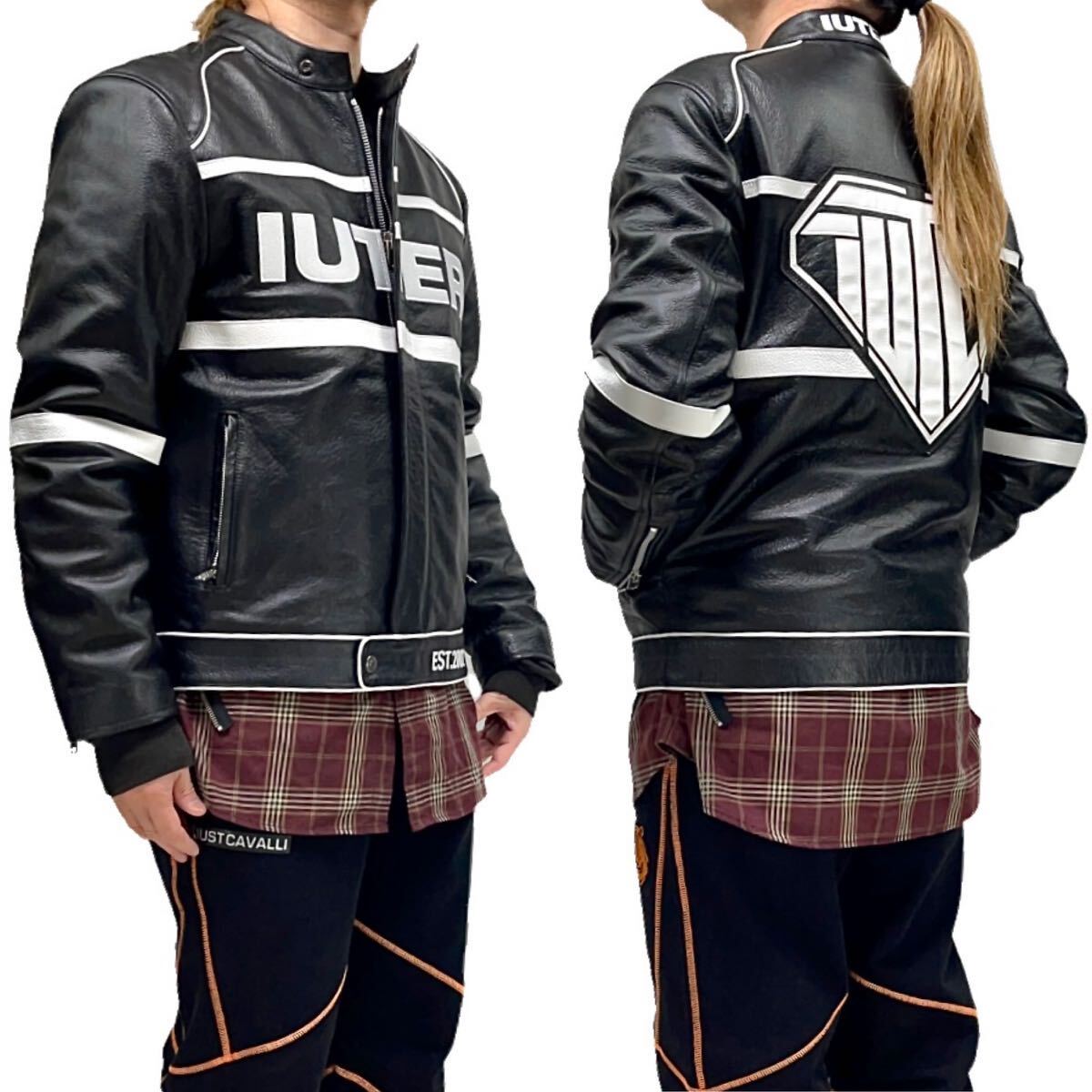 > 新品 IUTER イウター ブランドロゴ刺繍 バック ダイヤ柄 レザーワッペン ストライプ 裏地キルティング シングルライダース 黒 ブラック M
