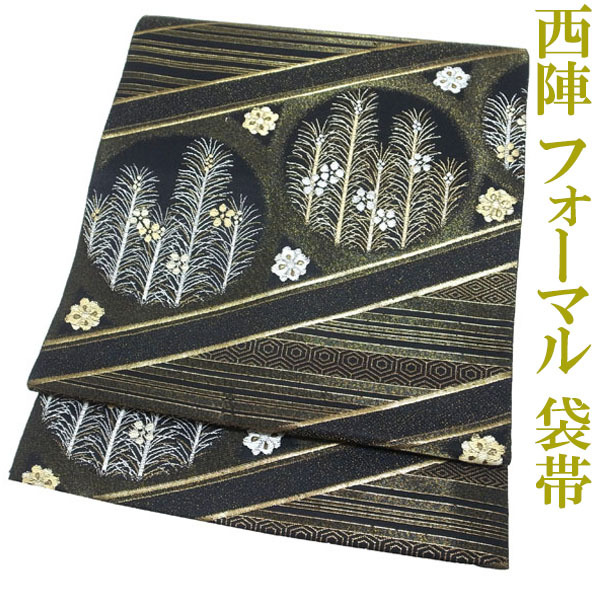 > 袋帯 京都 西陣 菊 松 花菱 金糸 黒地 黒 春秋冬 上質 正絹 絹 フォーマル 結婚式 お茶会 七五三 入卒式 なごみ 中古 仕立て上がり kp1355