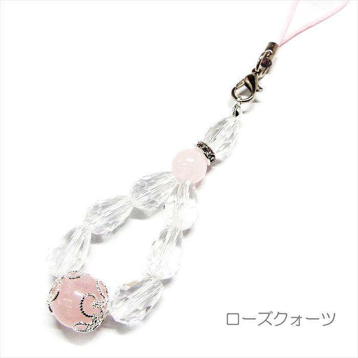 - パワーストーン ストラップ ドロップ型 透明 雫 天然石 ローズクォーツ クリスタルガラス 携帯
