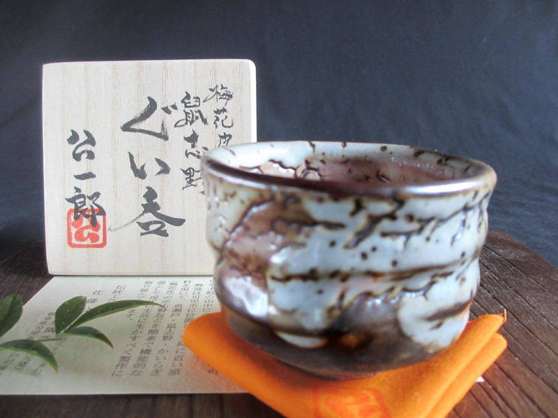 - ぐい呑み 梅花皮 鼠志野 ぐい呑 (穴窯) (共箱) 康元窯 佐藤公一郎 SK-143