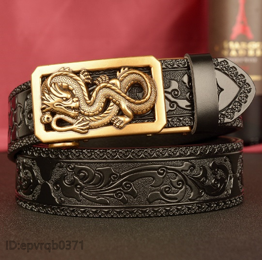 - レザーベルト 新品 オートロック式 バックル 龍ドラゴン 本革 柄物 メンズ ベルト 幅3.5センチ 紳士用 長さ調整可能 2色選ぶ/黒