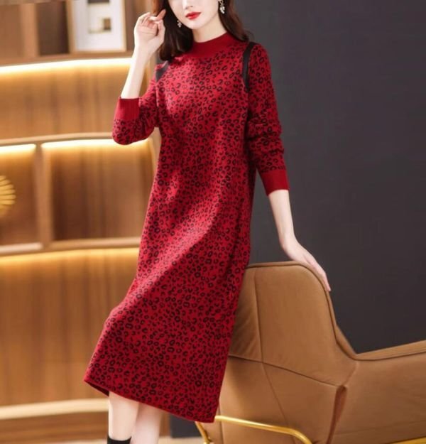 - LB396 秋冬 ニットワンピース 高級感 きれいめ プリント柄 着やせ 厚手 大人 セーター ロングワンピース オフィス 園行事 赤