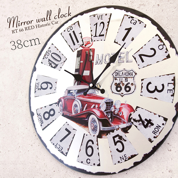 - ミラーウォールクロック 時計 38cm (レッド) アメ車 鏡 ルート66 道路標識 ガレージ 壁掛け ROUTE66 西海岸風 インテリア アメリカン雑貨