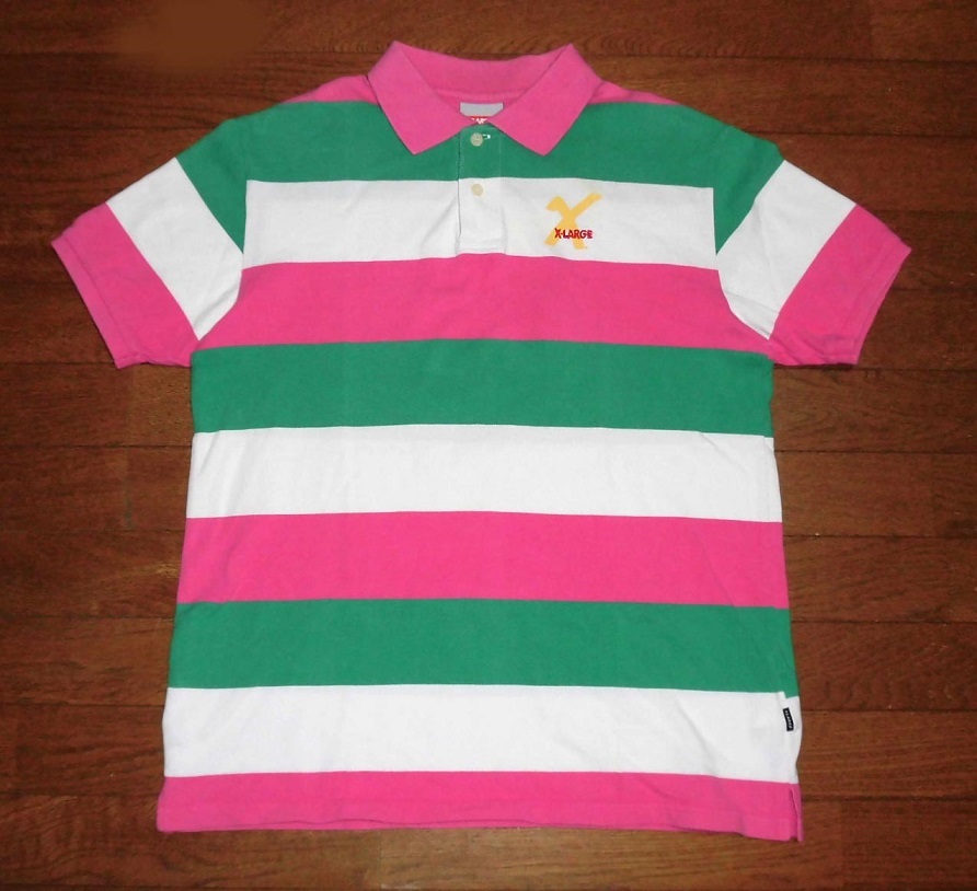 > X-LARGE エクストララージ 半袖 鹿の子 ボーダー ポロシャツ 刺繍ロゴ ビーズ正規品 PIK-GRN-WHT L USED 美品/猿顔OGゴリ武藤