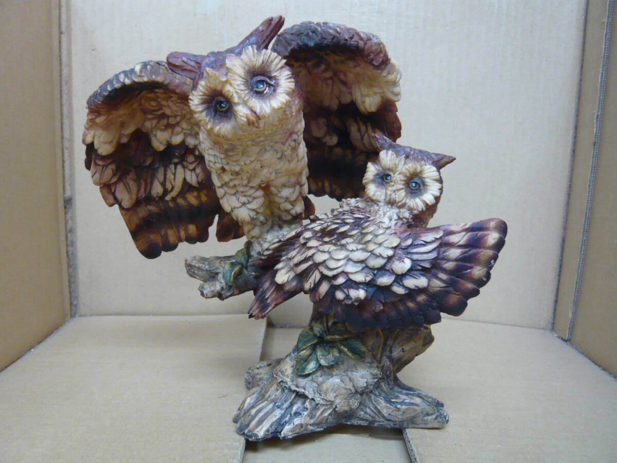 - 【中古品】木にとまる、白と茶色の2羽の木彫りのフクロウ置物 高さ 約23㎝