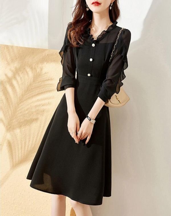 - LC141 上質 Vネック ワンピース オフィス通勤 気質 大人 着やせ 長袖 ひざ丈ワンピ Lサイズ