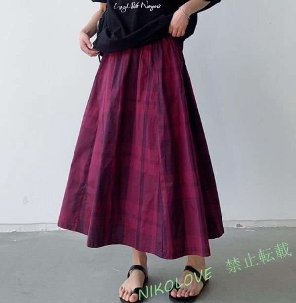 > LC175 今季 スカート ロング丈 チェック柄 フレアスカート レディース マキシ丈 ボトムス 大人 ワイン/XLサイズ