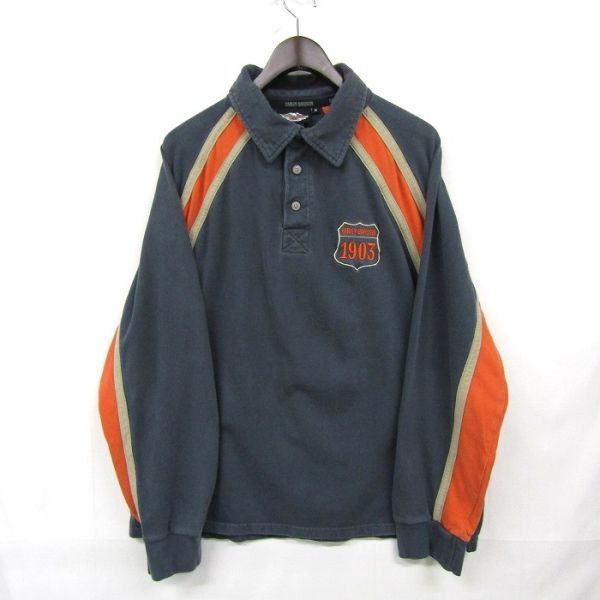 > サイズ M HARLEY DAVIDSON 長袖 ポロシャツ カットソー 切替デザイン 刺繍 ロゴ グレー ハーレー ダビッドソン 古着 ビンテージ 4A2703