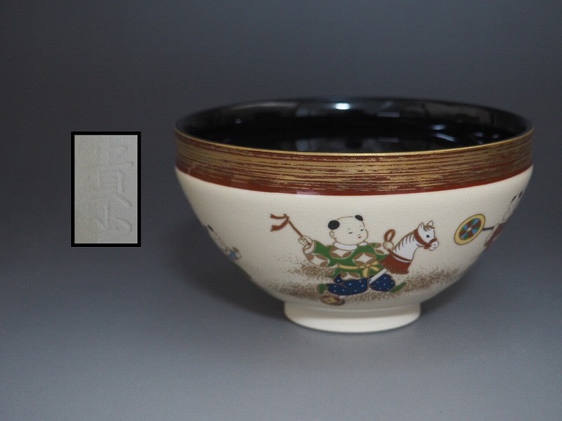> A2541 京焼 貴山 作 色絵唐子文 天目茶碗 ☆ 茶道具 抹茶器 茶器 抹茶道具 茶懐石 茶事 茶碗 抹茶碗 陶器 作家物 在銘 陶印 美品 良品 無傷