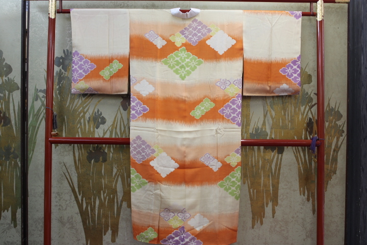 > きもの今昔6933 長襦袢 バチ衿袷手縫い仕立 精華織に友禅染が美しい やや経年経過 身丈125cm