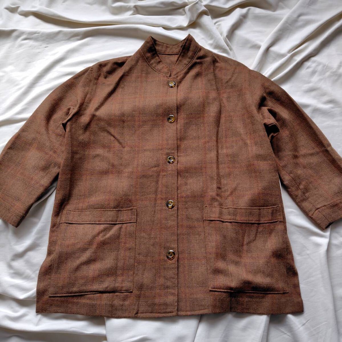 - 80s 90s レディースL位 ヴィンテージブラウス ブラウン 茶 総柄 チェック柄 昭和レトロ 長袖シャツ No.10 スタンドカラー