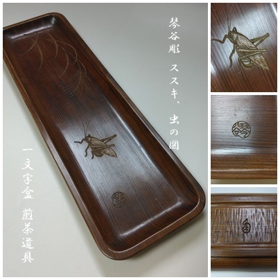- 【S-81】琴谷彫 ススキ 虫の図 一文字盆 煎茶道具