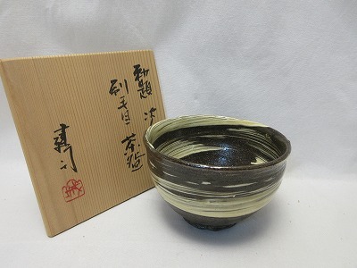 - J04067 【 未使用 茶道具 山城建司作 刷毛目 茶碗 陶印 栞 共箱 】 検) 作家物 煎茶道具 茶事 茶会 茶器 茶具 お点前 来客 お稽古 ⅰ
