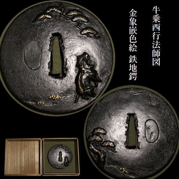 > 【 恵 #1156 】 鉄味抜群! 牛乗西行法師図 鉄地鍔 金銀象嵌色絵 検:鍔/縁頭/切羽/ハバキ/刀剣/刀装具