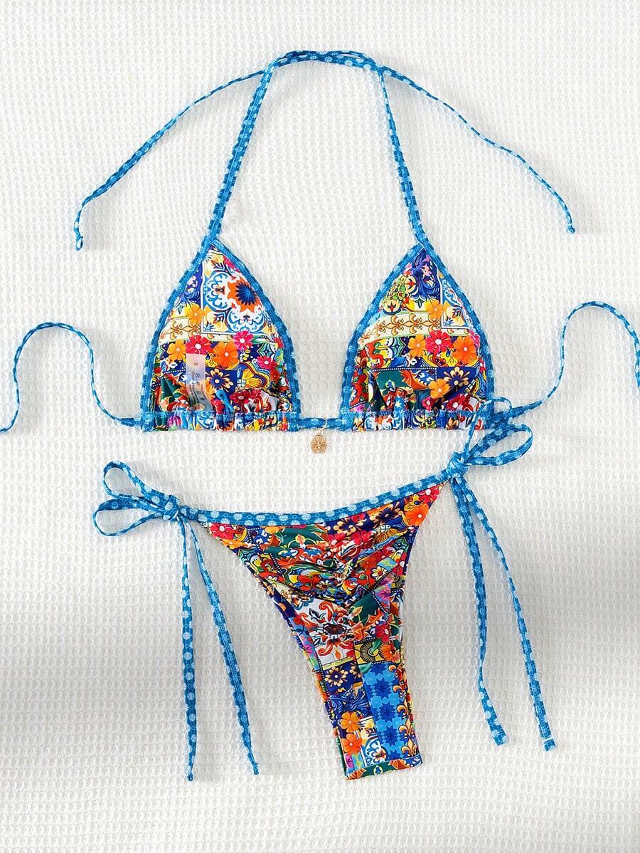 - レディース 水着 ビキニセット 柄入りホルターネックビキニセット、2点セット、ストリングビーチ水着、夏用