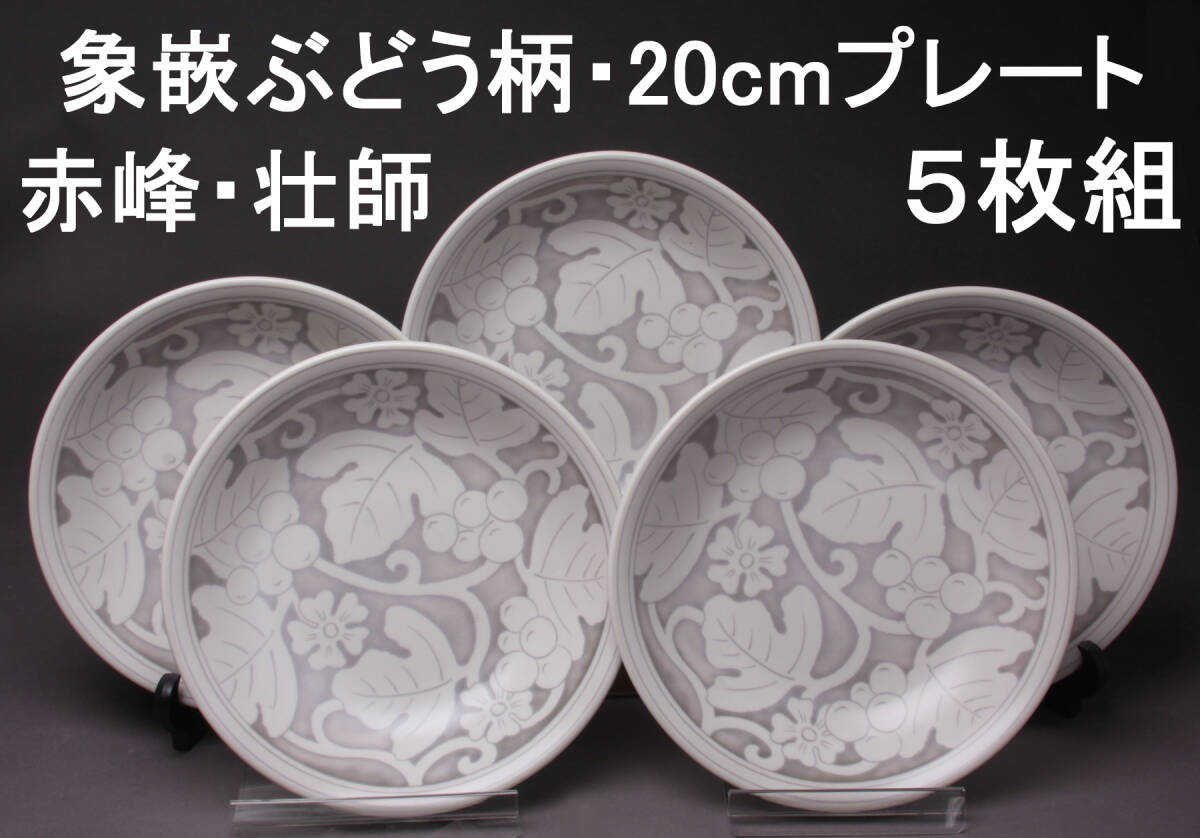 - 赤峰 壮師 象嵌ぶどう柄 直径20㎝プレート5枚組 箱付き KA-7533