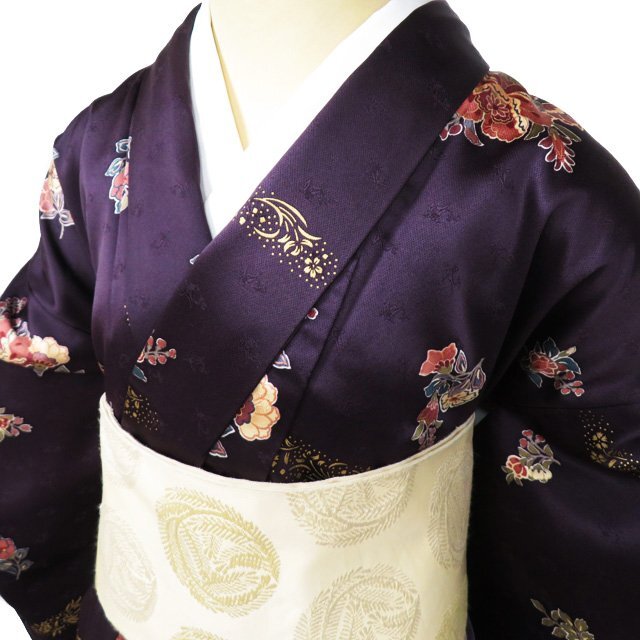 > 小紋 着物 中古 正絹 袷 カジュアル 刺繍 花模様 地模様 黒鳶色 多色 金 身丈161cm 裄64cm M きもの北條 A1027-3