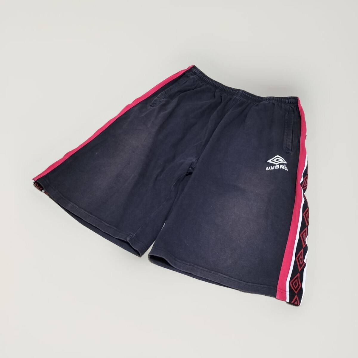 > 希少★90s OLD UMBRO ハーフパンツ ショーツ 刺繍ロゴ サイドテープ 黒 赤 サイズL アーカイブ ヴィンテージ オールド アンブロ 古着 USED