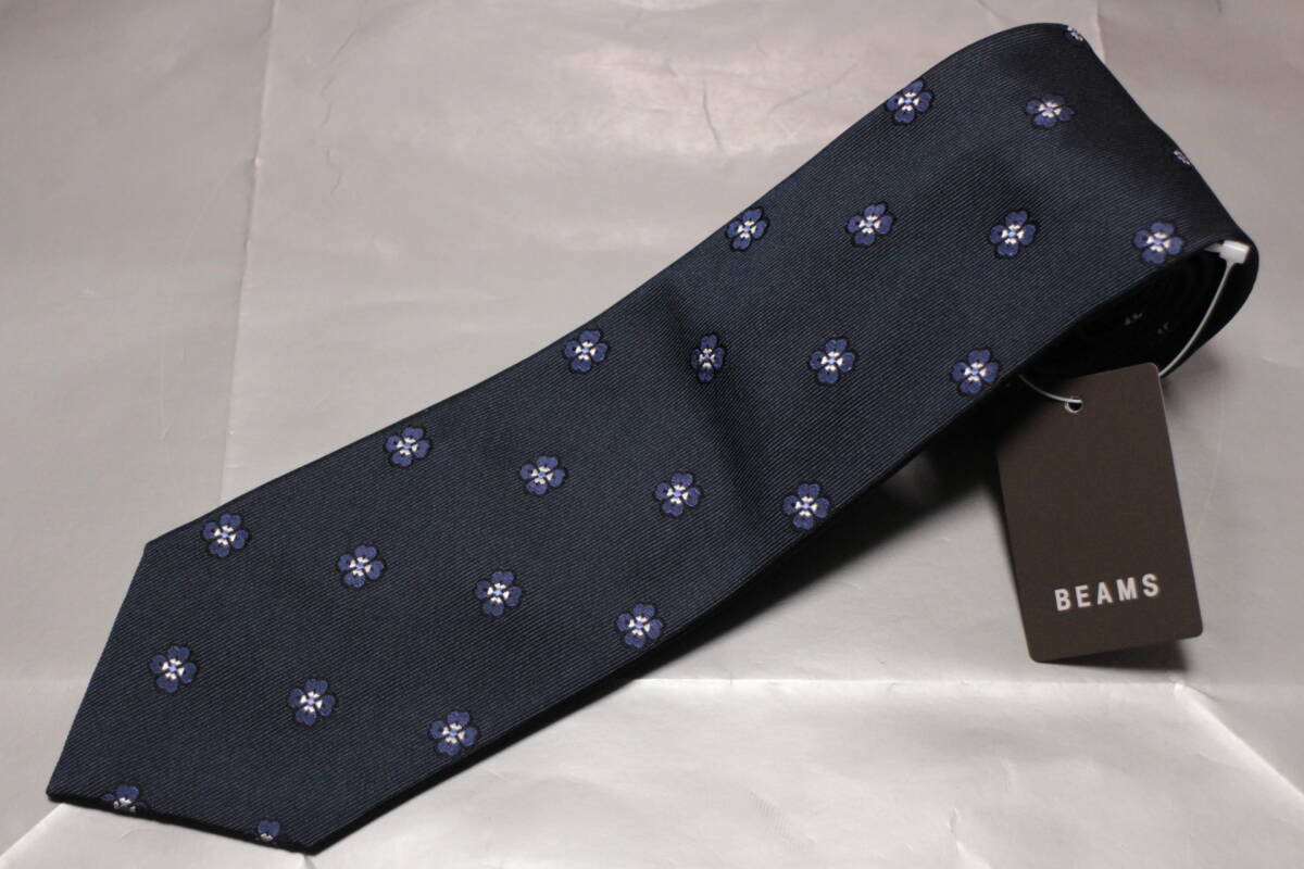 - ビームス新品ネクタイ超シック艶美麗ネイビー*ブルー*シルバー花小紋重厚ツイル織ジャガード刺繍フルハンドメイド