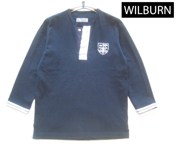 - 美品イギリス製!!ウィルバーン Wilburn*エンブレム刺繍 7分袖 ノーカラーラガーシャツ 36 実寸S 紺 ネイビー