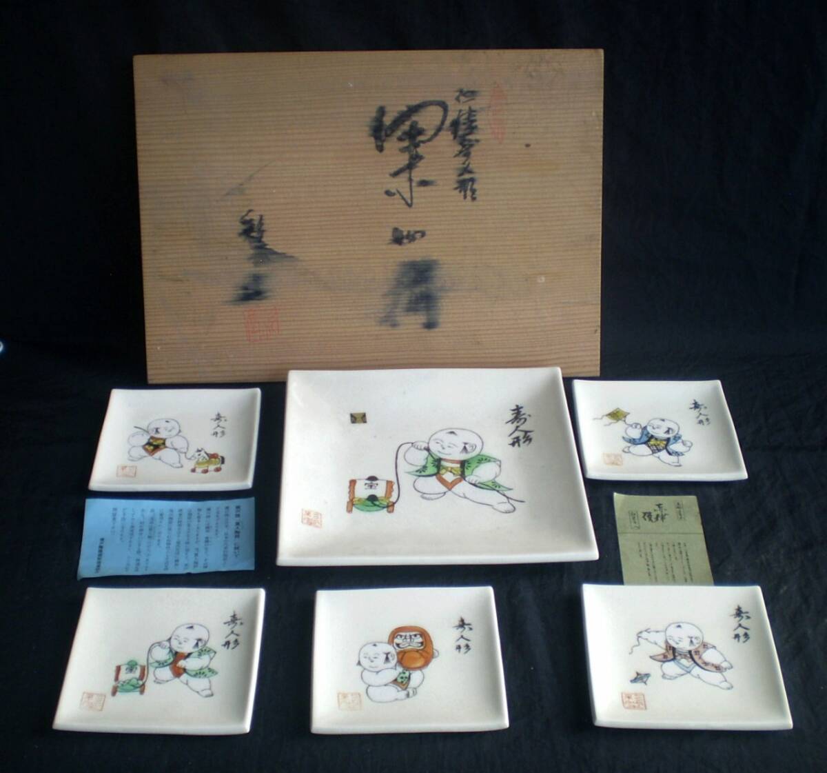 - 赤津焼 彩堂 仁清道中 銘々皿 菓子皿 6点セット 御所人形 絵変わり 貫入模様 木箱付 茶道具/煎茶道具【未使用 長期保管】