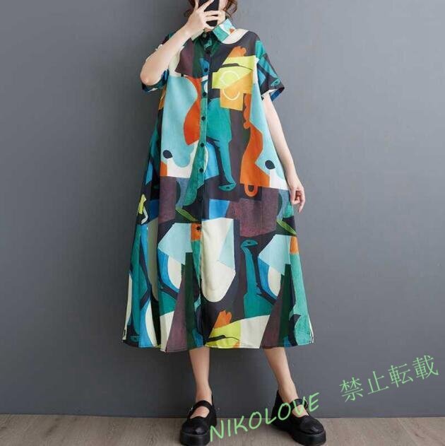 - 新品可愛い上質ロングワンピース 大人可愛い 体型カバー 大きいサイズ 切り替え 半袖 花柄ワンピース シャツワンピースグリーンF LD008