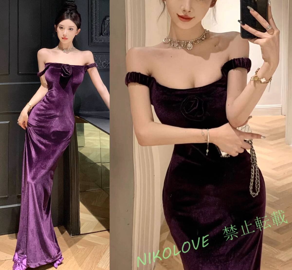 - ☆新品*良質*とろみ素材*オフショル*肩開き*バラ*付*スリット*入ベロア*素材*ロング*ワンピース*紫*パープル*結婚式*パーティ*LF673