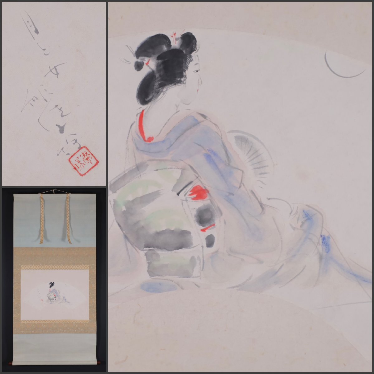 - 【模写】吉】10937 梶原緋佐子 月と女図 共箱 菊池契月・吉井勇師事 美人図 大和絵 風俗画 茶掛け 茶道具 掛軸 掛け軸 骨董品