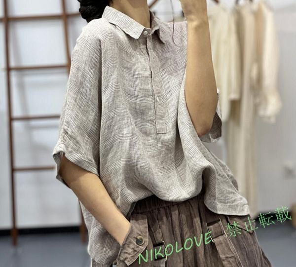 > 新品 チュニック レディース シャツ ブラウス 綿麻 チェック柄 半袖 トップス ナチュラル 着痩せ ゆったり XL LH076