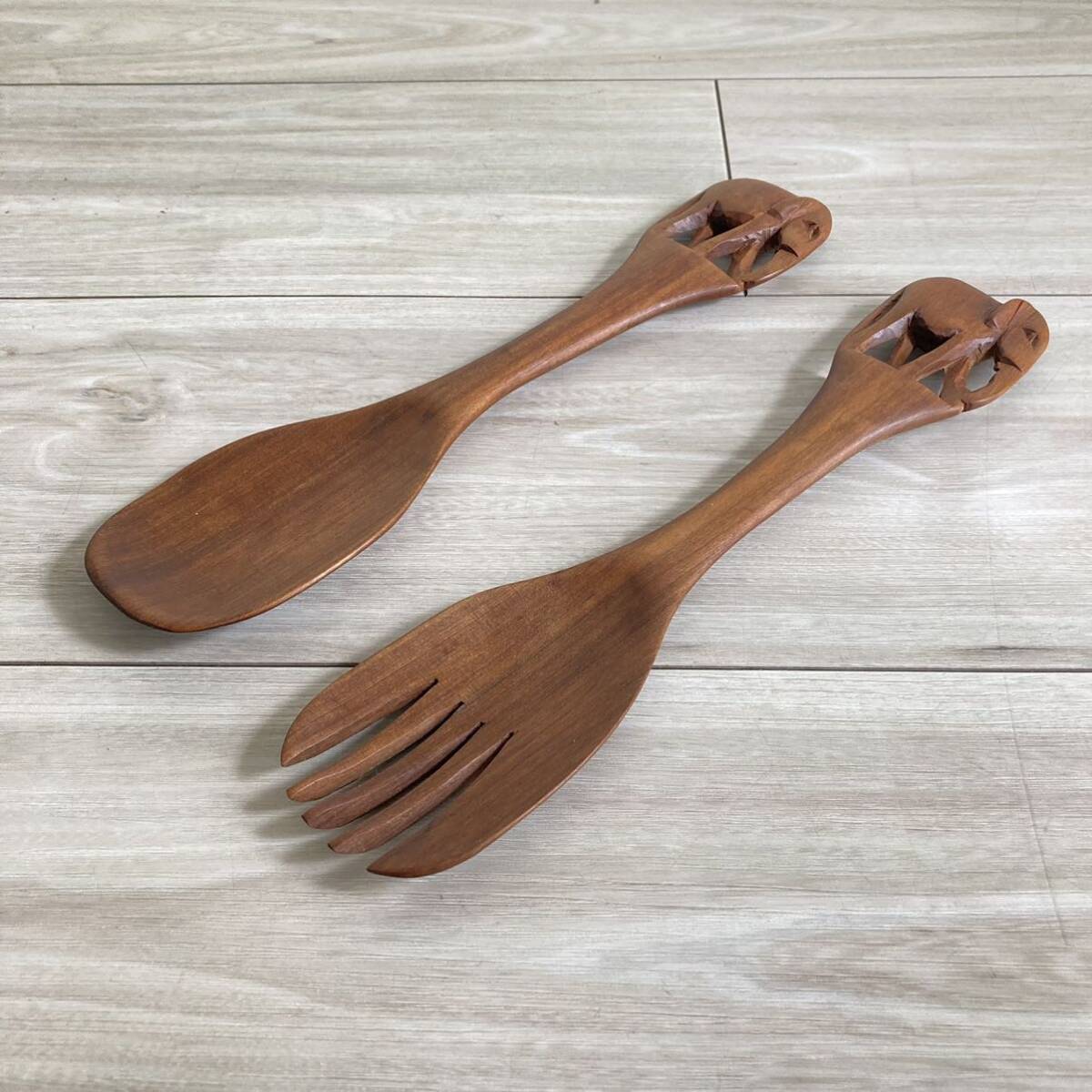 - ビンテージ チーク無垢材 サラダサーバーセット 象モチーフ