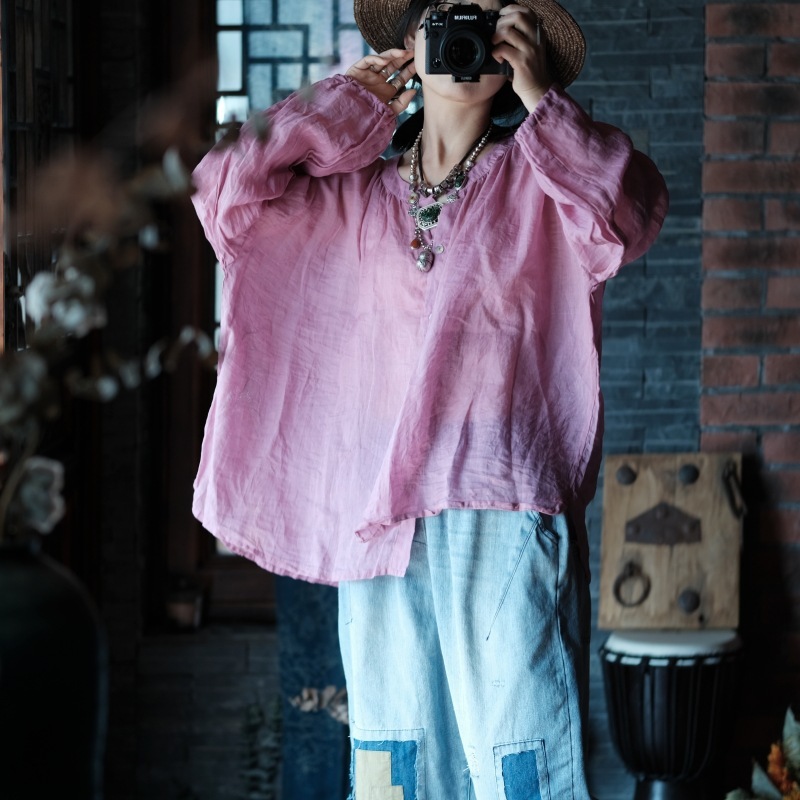 - 未使用 チュニック ワイシャツ 襤褸 アンティーク風 洋服ミックス ロマンファッション ポップ ゆったり 麻100%リネン ピンク Vネック