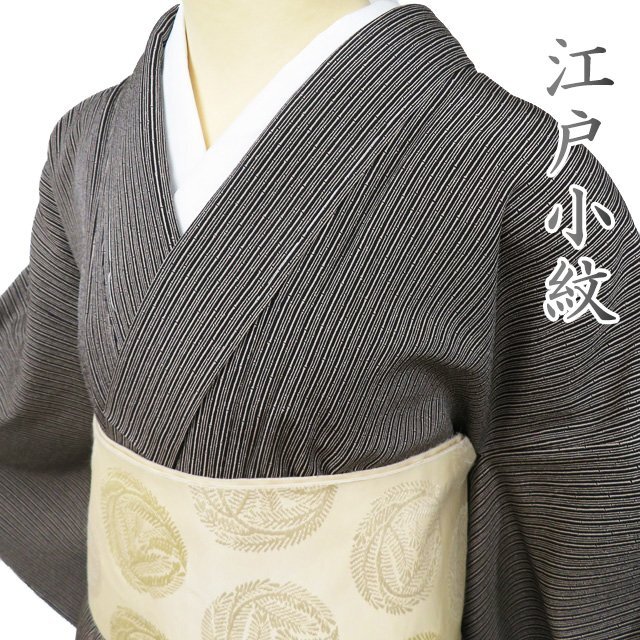 > 江戸小紋 着物 未使用 正絹 袷 伝統工芸伊勢型写 竹縞模様 反端付き 黒色 亜麻色 身丈158.5cm 裄64.5cm M きもの北條 A1052-4