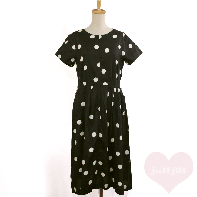- 古着 ワンピース 水玉 ドット 黒白 昭和レトロ モード 70s 80s ビンテージ ヴィンテージ vintage レディース古着 綿100 コットンワンピース