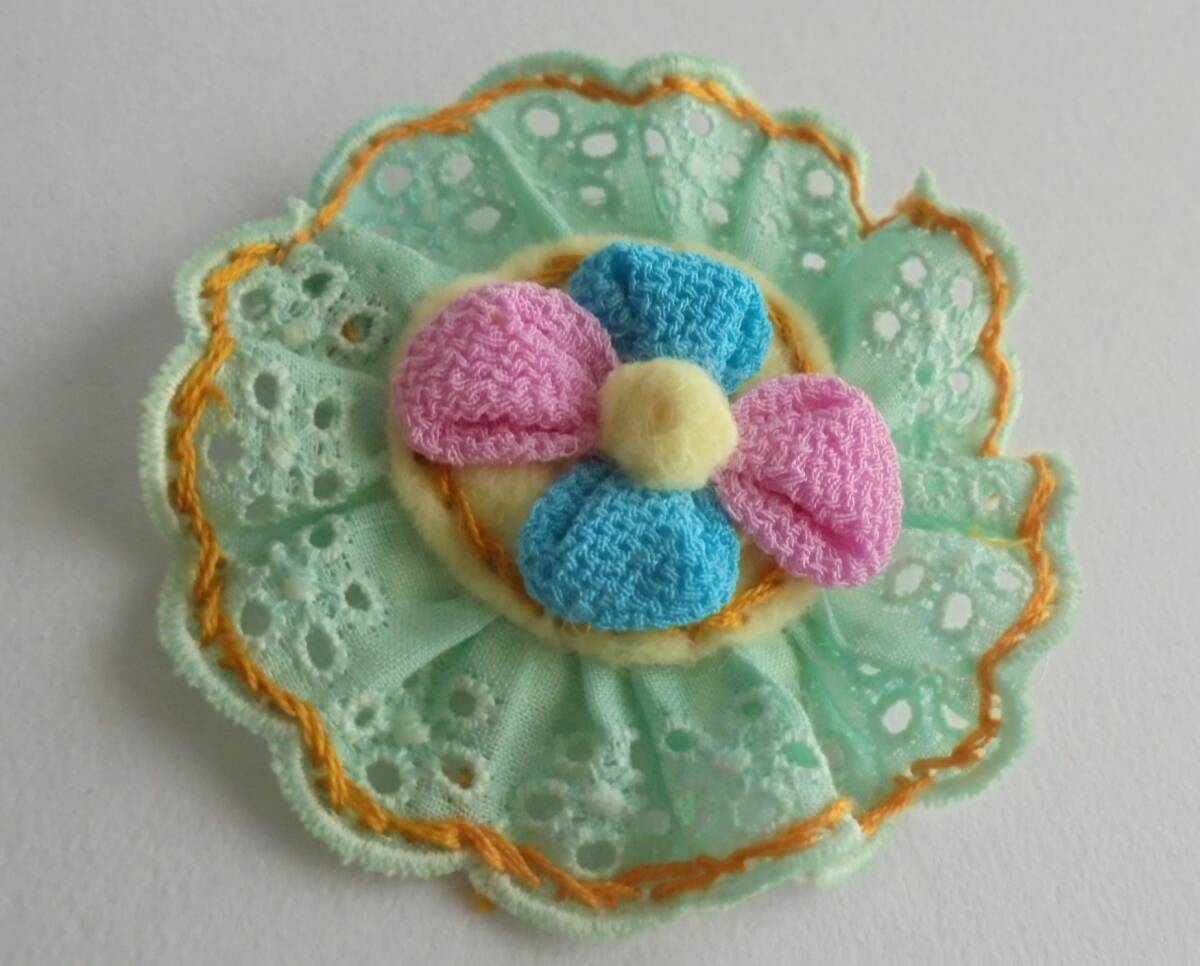 - ♪ ハンドメイド お花 ブローチ 綿レース フエルトに刺繍 つまみ細工