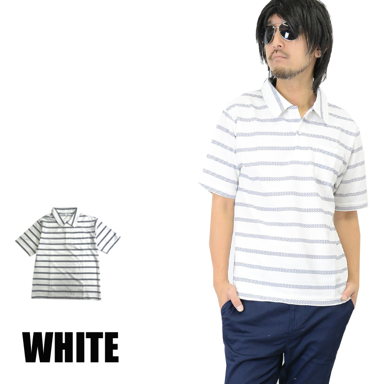 - ストレッチワッフル生地 ボーダー 半袖ポロシャツ ストレッチ 75552 新品 ホワイト L