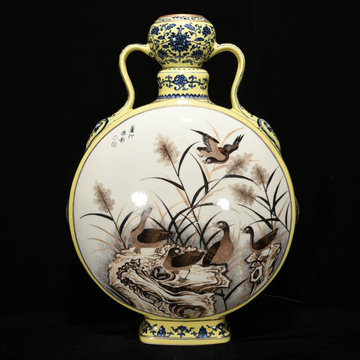 - ◆旧蔵◆古美術 中国古玩 大清乾隆年製款 黄地青花墨彩花鳥紋大扁瓶 唐物L