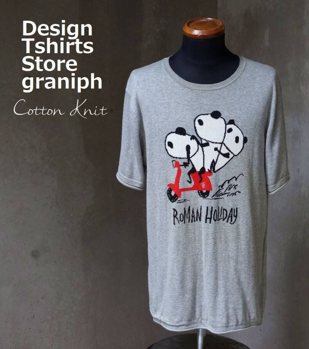 > グラニフ graniph ローマの休日 ROMAN HOLIDAY 三匹のパンダ 赤ベスパ グレー 綿 コットンニット 半袖 Tシャツ M