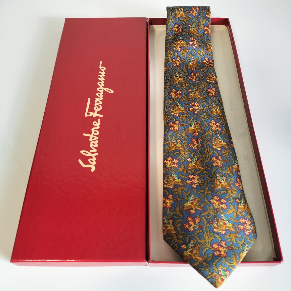 - Salvatore Ferragamo(サルヴァトーレフェラガモ)水色馬に人花ネクタイ