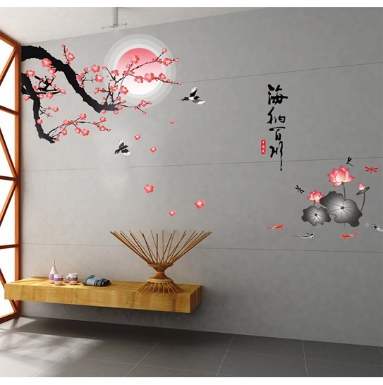 - ウォールステッカー 梅と蓮 書道 木の枝 和風 はがせる 壁紙シール 花鳥風月 鯉 トンボ デザイン 早春 取り外し可能 縁側 部屋の中