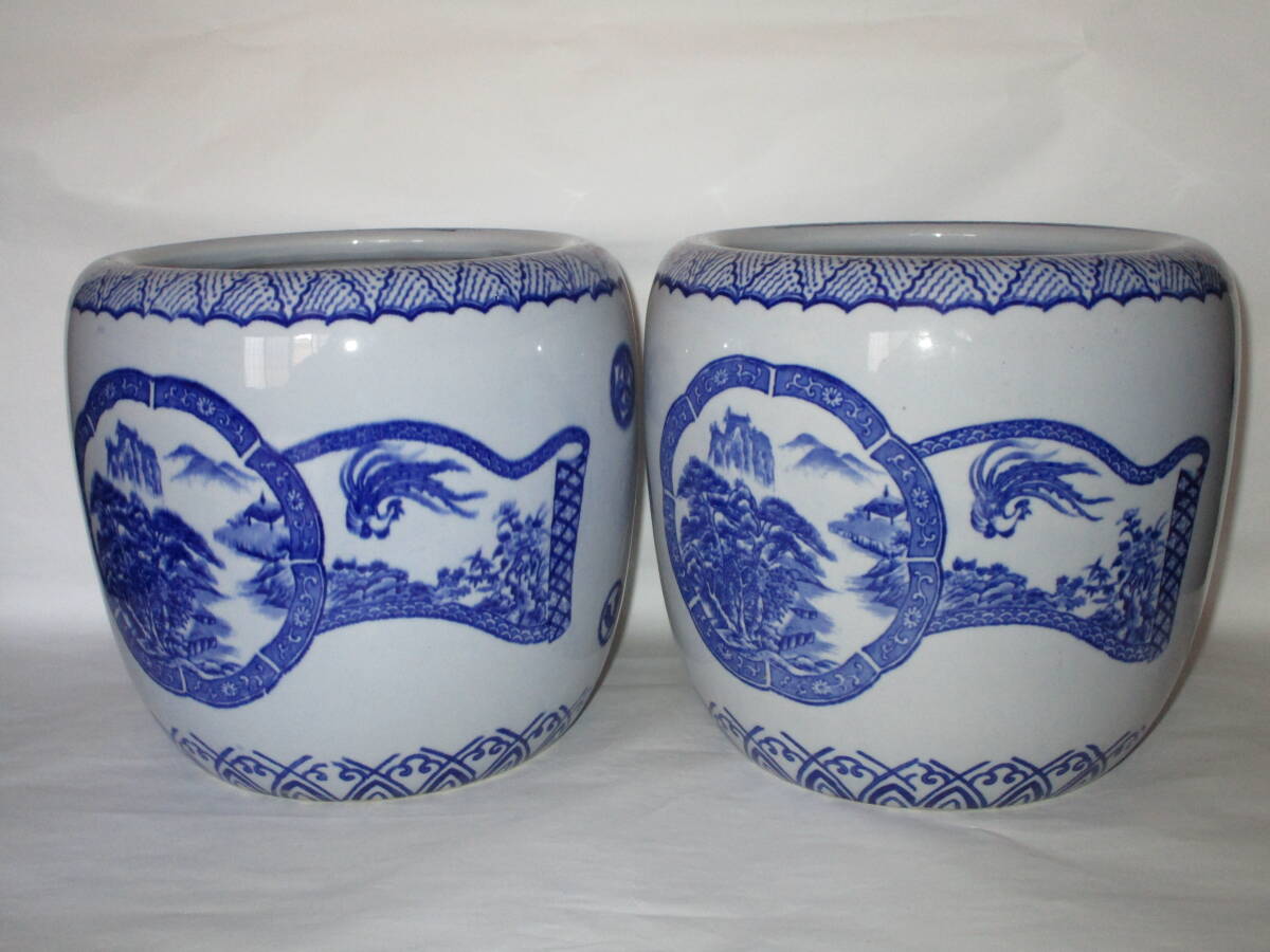 - 【時代物】古い 染付 印判 火鉢 瓶掛 2点(1対) (高さ22.5cm) ●無傷●