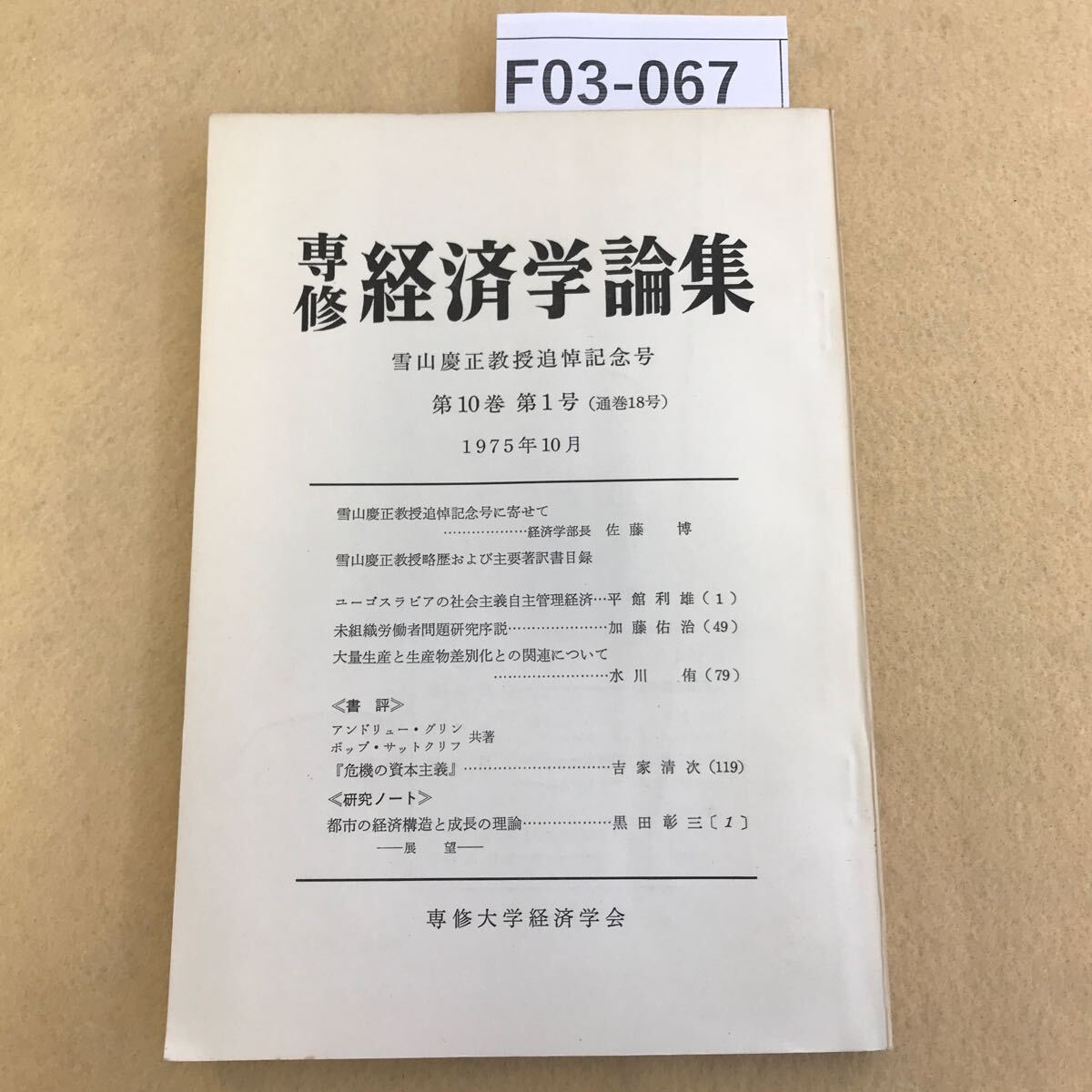 - F03-067 専修経済学論集 雪山慶正教授追悼記念号 第10巻 第1号(通巻18号)1975年 10月 汚れ有り