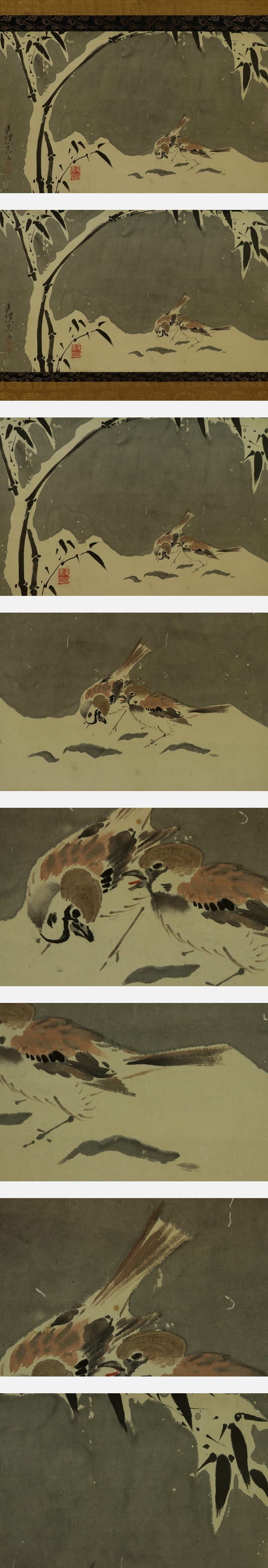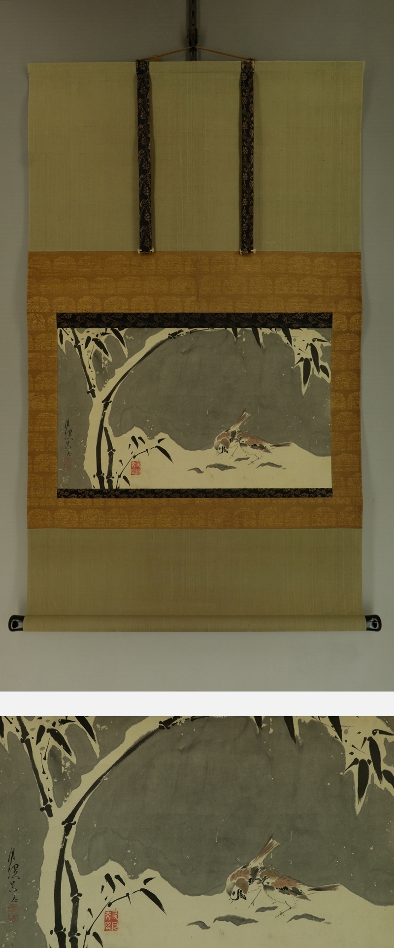 - 【模写】松村呉春【積雪雀】◆紙本◆合箱◆掛軸 s06030