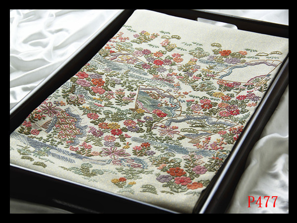> P477厳選西陣 相良刺繍 扇面四季花紋 灰黄緑色地 気品豊かに 正絹純金糸太鼓柄高級美術袋帯 ◇検◇簪着物名古屋帯帯締め