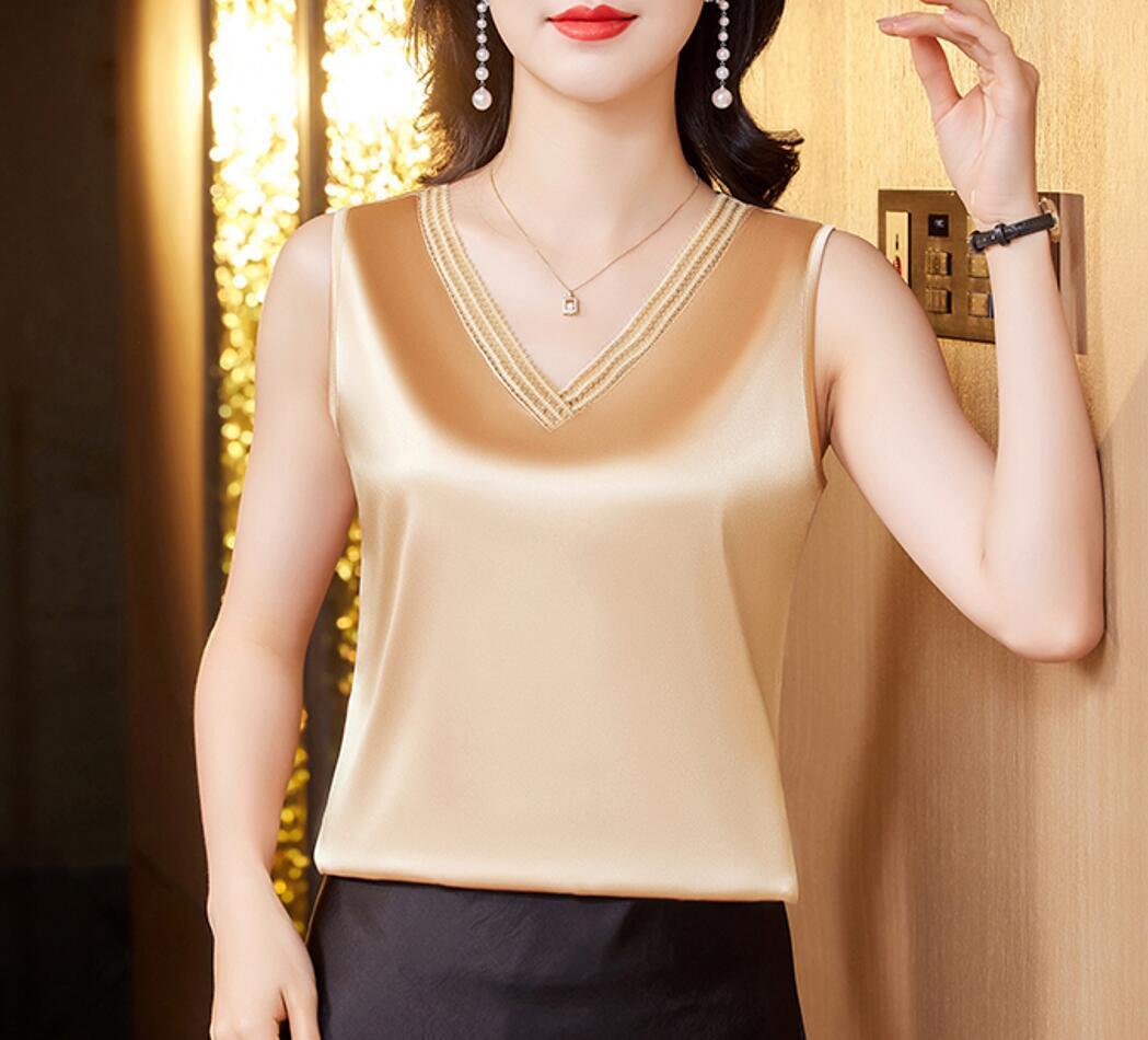 - 新品 人気推薦 /上品 光沢感 トップス ノースリーブ シャツブラウス 薄手 Vネック 着痩せ サテンブラウス オフィス通勤 大人 /シャンペン
