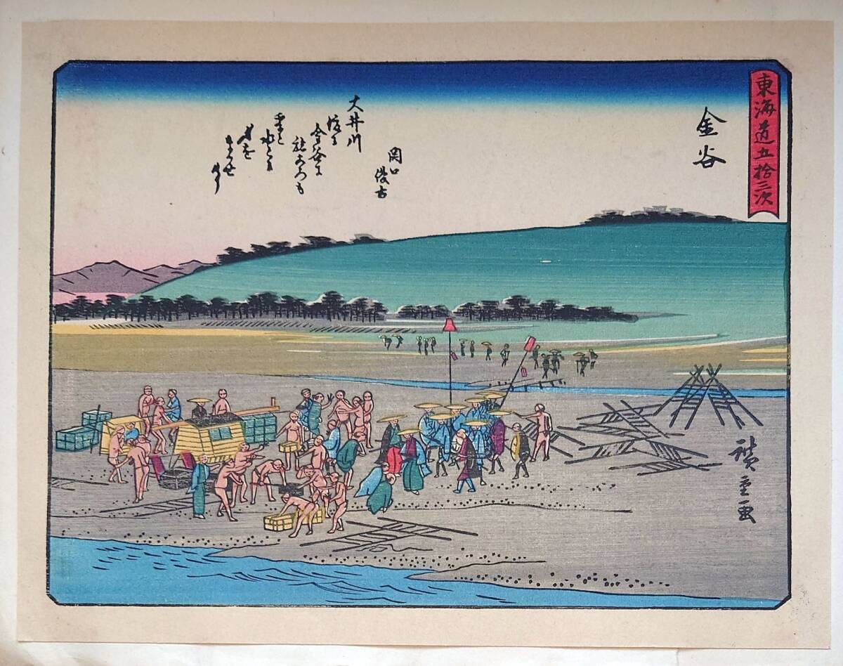 - f24040425〇彩色木版画 佐野喜版 狂歌入東海道五十三次 金谷宿 広重 複刻昭和年代〇和本古書古文書