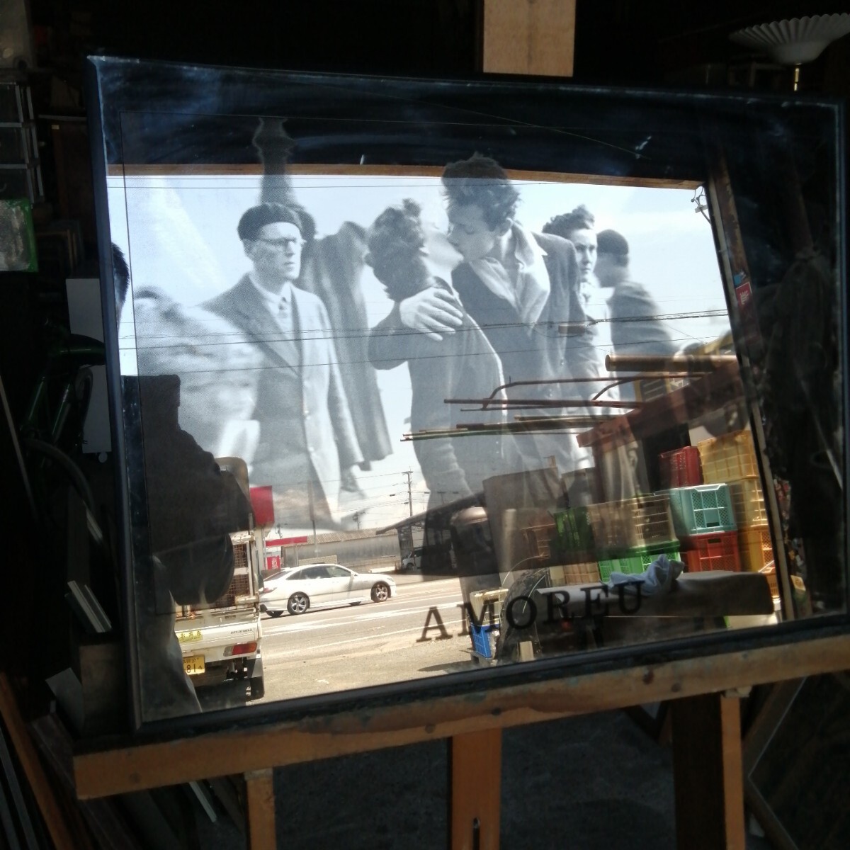 - 佐賀発 アモーレ 愛 鏡 KISS 外国 AMOREU ガラス (約600×455mm) ガレージ装飾