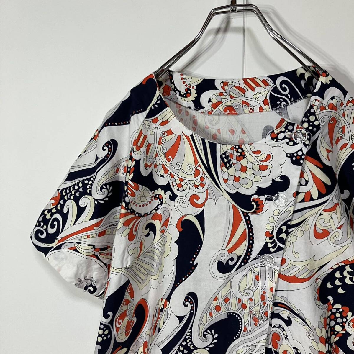 - 古着 ヴィンテージ ペイズリー デザイン レトロ ダーツ ポケット ラグラン 半袖 ひざ丈 ワンピース ホワイト ネイビー オレンジ クリーム