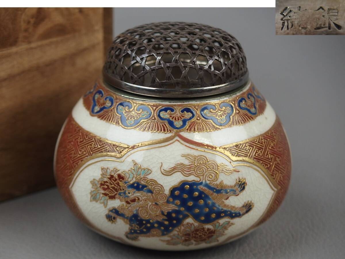 - 【骨董・茶道具】★古い 薩摩焼★★色絵獅子文香炉 純銀火舎(火屋) fn109ul.7 麒麟 香道具