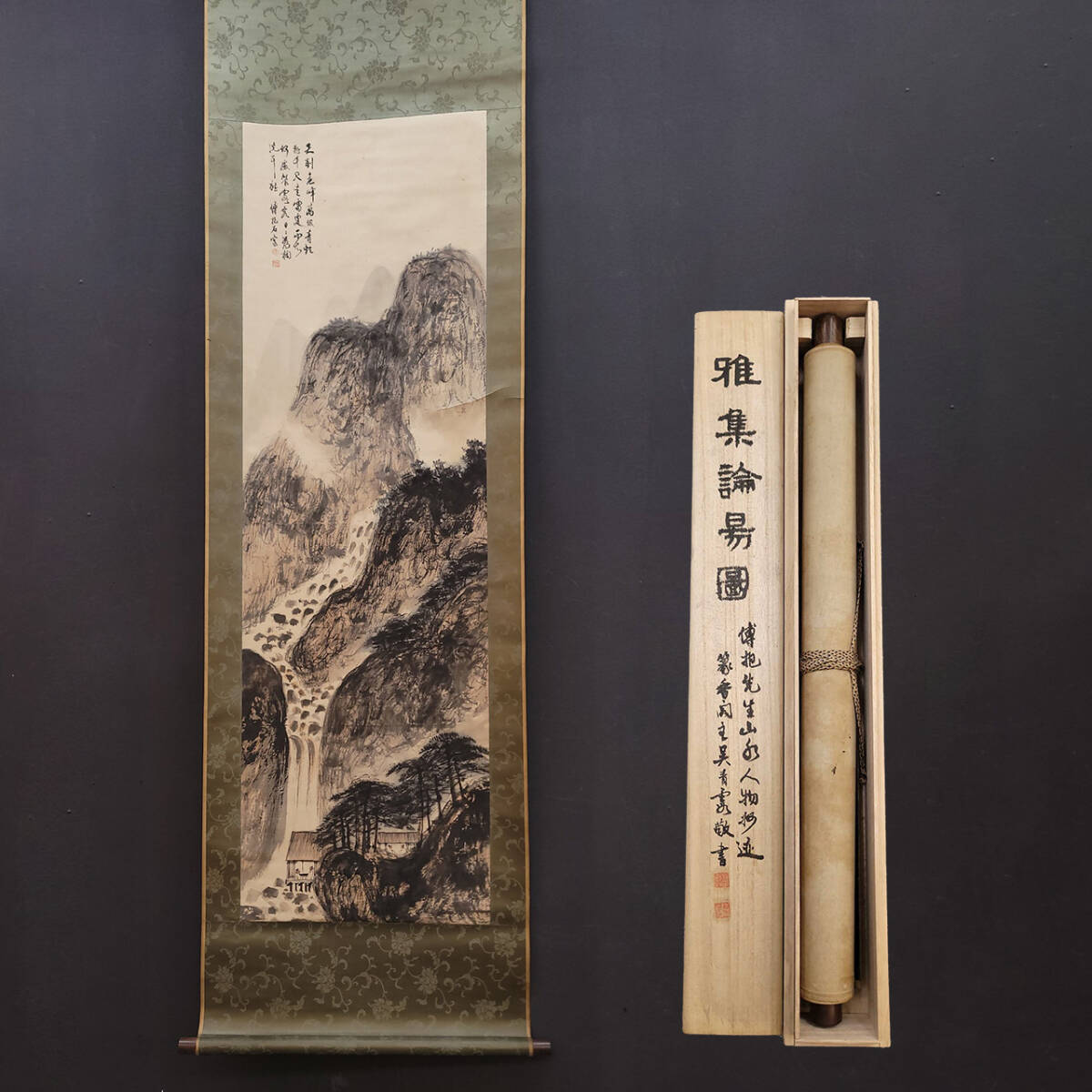 - 古美術 掛け軸 中国・近現代 「傅抱石書」 紙本 【雅集論易図】 立軸 書道 巻き物 木箱付 真筆逸品 肉筆保証 唐物 古画 LT-2408154